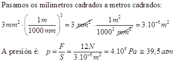 S12. Un coitelo afiado corta ben porque a súa superficie de apoio é moi pequena. Calcule a presión que exerce o gume dun coitelo de 3 mm2 de superficie se facemos unha forza sobre el de 12 N (unha forza pequena).