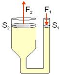 No émbolo pequeno faise unha forza F1 sobre unha superficie pequena S1, resultando unha presión sobre o líquido. Esta presión transmítese ata o outro émbolo ou pistón sen cambiar de valor, polo que: