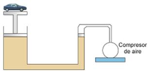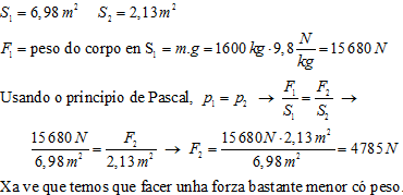 Nun elevador hidráulico (prensa de Pascal) o émbolo maior mide 6,98 m2 de área e o menor 2,13 m2. Que forza hai que facer sobre o menor para poder levantar unha carga de 1 600 kg colocada enriba do émbolo maior?