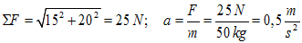 S34. Dous nenos están axudando a aprender a montar en bici a outro. Cada un tira dun lado do guiador con forzas que forman ángulo recto entre si; unha das forzas é de 15 N e a outra é de 20 N. Se a masa da bicicleta mais a do neno é de 50 kg, que aceleración adquiren?