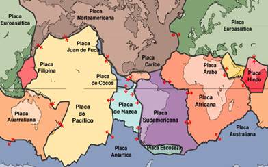A litosfera está dividida en catorce grandes placas: Pacífica, de Nazca, Norteamericana, Sudamericana, Eurasiática, Africana, Indo-australiana, Antártica, Escocesa, Filipina, arábica, do Caribe, de Cocos e Xoán de Fuca