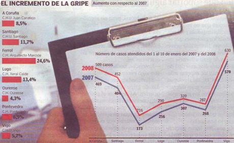 O gráfico que se achega apareceu en La Voz de Galicia o pasado 12 de xaneiro de 2008 para ilustrar o incremento do número de casos atendidos nos hospitais galegos debido á gripe. A verdade é que é moi desafortunado, xa que á primeira vista o gráfico dá unha idea de que hai un aumento moi grande; pero se nos fixamos nel observamos que o gráfico está mal construído, pois non se poden unir, mediante liñas, modalidades que en principio non teñen relación ningunha. Nun carácter estatístico cualitativo (atributo), como é este, no que as modalidades son as cidades onde se mide a frecuencia con que se acode aos seus hospitais, o gráfico máis axeitado sería un diagrama de barras ou un diagrama de sectores.