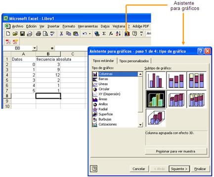 Seleccionamos columna de frecuencias e prememos na icona que nos leva ao Asistente para gráficos, que sinalamos antes. Eliximos o tipo de gráfico e un subtipo, por exemplo Columnas e Columna agrupada con efecto 3D.
