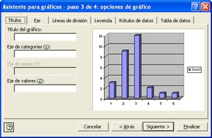 Premendo Seguinte pásase por varios menús para definir as características do gráfico. No menú Serie, seleccionamos Rótulos para o eixe de categorías para marcar os datos da primeira columna, que logo apareceran no eixe horizontal.