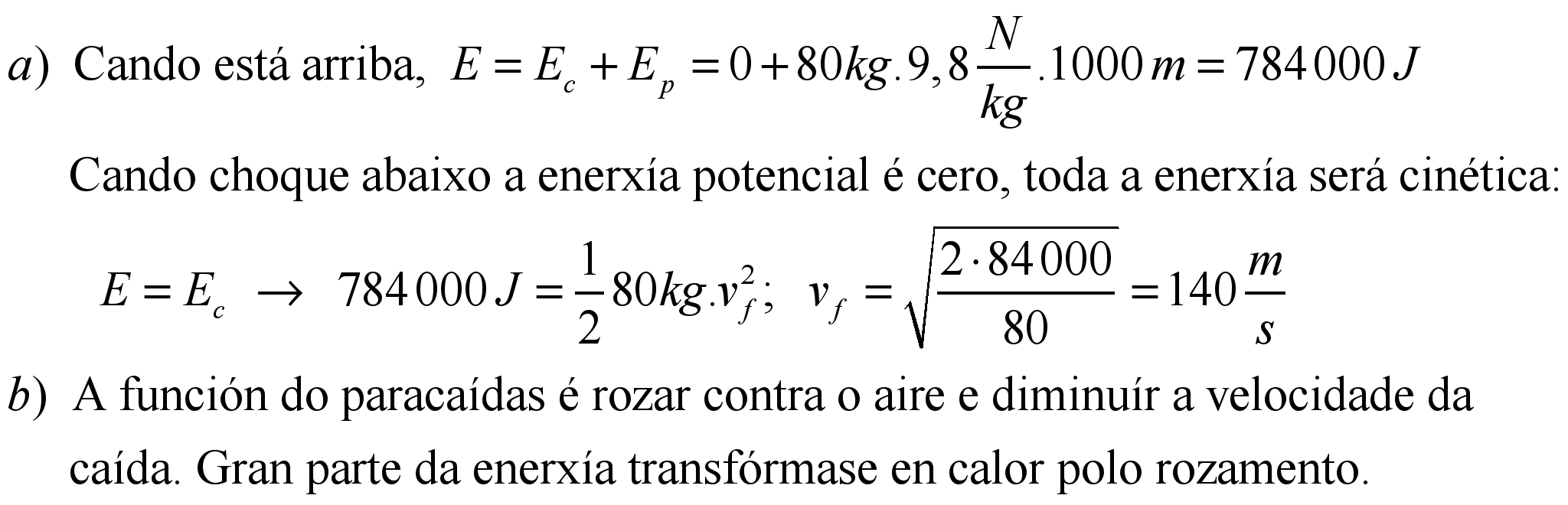 S39. Un paracaidista salta ao aire desde unha altura de 1 000 m. A súa masa mais a do equipo de salto é 80 kg.