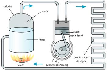 No interior do recipiente pechado da caldeira quéntase auga mediante algún combustible. O vapor xerado envíase cara a un mecanismo ou motor formado por un cilindro oco cun pistón ou émbolo interior perfectamente axustado. O vapor exerce presión sobre o pistón e pono en movemento orixinando algún tipo de enerxía mecánica (como a de xiro dunha biela representada na ilustración). |