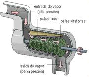 A entrada de vapor de auga a alta presión fai mover un rotor, é dicir, un conxunto de palas situadas ao longo dun eixe. O diámetro das palas aumenta cara á saída do vapor, de xeito que este se vai expandindo e perdendo presión á medida que avanza. |