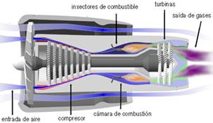 O aire entra no motor impulsado por unha hélice que o dirixe cara a un compresor. Este é un conxunto de paletas cuxo diámetro diminúe ao avanzar o aire de forma que se comprime. O aire comprimido pasa a unha cámara de combustión onde se mestura co combustible (xeralmente queroseno) e se produce a combustión. A saída dos gases provoca, por unha banda, o movemento do avión por reacción e, por outra, acciona as turbinas que moven o compresor, e producen electricidade para o uso do aparello. |
