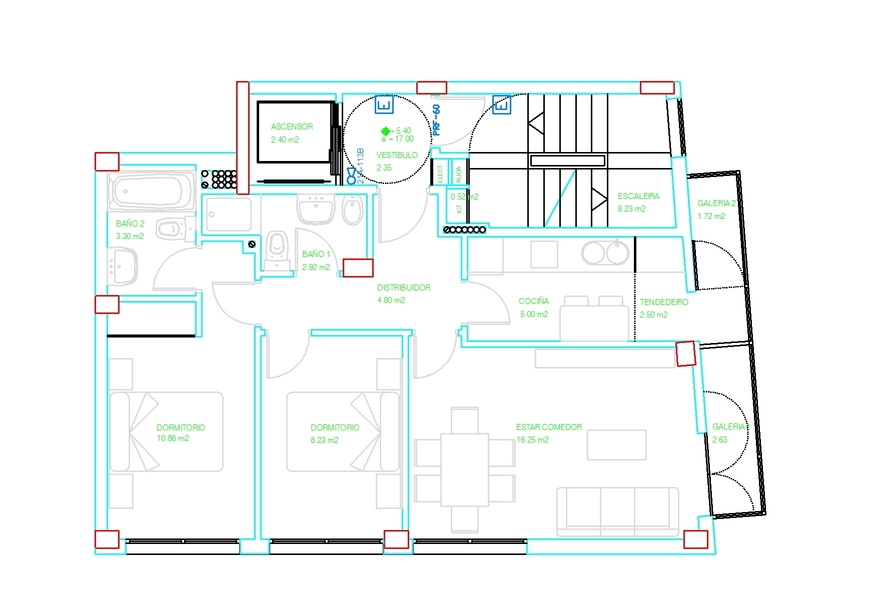 Os corredores terán unha largura libre mínima entre paramentos de 1 m para permitir o paso dunha cadeira de rodas, e deberá contar con espazo para acceder e xirar polo menos dentro dun cuarto de baño da vivenda.