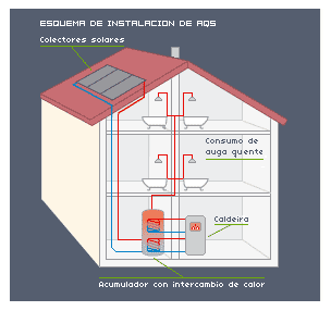 De acordo coas normas do hábitat galego, nos edificios de nova construción é obrigatoria a instalación dalgún sistema de produción de auga quente baseado en enerxías alternativas. O sistema máis utilizado na actualidade é o de enerxía solar térmica que concentran a enerxía dos raios solares grazas a uns paneis chamados colectores que funcionan mediante o efecto invernadoiro e que adoitan estar instalados na cuberta dos edificios. A auga quente producida almacénase nun depósito acumulador para a súa distribución posterior a través do circuíto de auga quente. Cando a radiación solar non é suficiente para quentar a auga demandada na vivenda, entra en funcionamento o equipo xerador auxiliar: caldeira eléctrica, a gas, a gasóleo, etc.