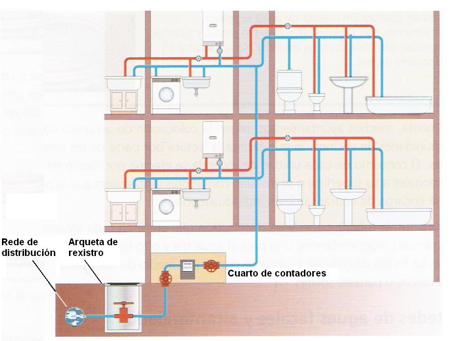 A acometida realízase desde a arqueta de rexistro na que está situada a chave de paso xeral do edificio. Cando se trata de edificios con máis dunha vivenda pasa ao cuarto de contadores, despois dos cales se coloca unha válvula de retención para evitar o posible retroceso da auga. De aquí saen os montantes ou columnas de subida que levan a auga a cada vivenda, dividíndose dentro en dúas ramas, unha para a auga fría e outra para a auga quente. Os materiais máis utilizados na actualidade nestas conducións son o polietileno reticulado e o polipropileno, aínda que tamén se utilizan o cobre e o aceiro.