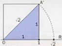 Para representar os irracionais na recta real tomamos regra e compás para calcular o seu valor, polo procedemento do debuxo. Trátase de calcular o valor da hipotenusa dun triángulo de lado 1, e trasladalo co compás á recta real. No segundo caso, de novo temos a hipotenusa dun triangulo rectángulo de lados 1 e