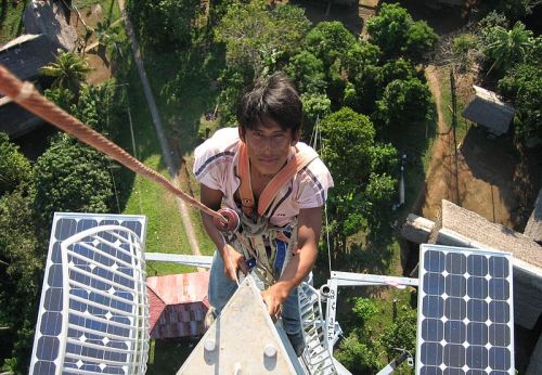 A tecnoloxía Wimax permite ofrecer localmente servizos de banda larga nun radio de até 50 km do punto de acceso. A veciñanza dun pobo da India instala unha antena Wimax no alto dunha vivenda. Foto en Flickr de Buddhima W.Wickramasinghe (CC BY-NC-SA 2.0).