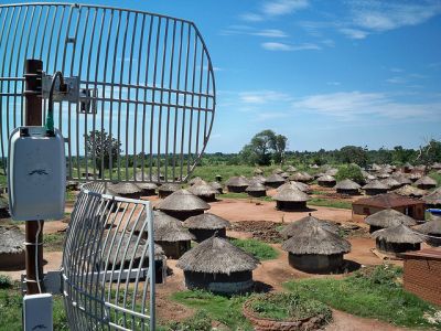Mediante antenas direccionais é posible crear redes WI-FI de larga distancia que permiten ampliar, a baixo custo, a cobertura de acceso a Internet. Esta aldea de Uganda dispón dunha solución deste tipo. Foto en Flickr, Michaelischool (CC BY-NC-SA 2.0).