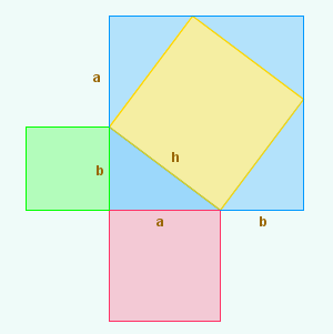 | Se formamos un cadrado cuxo lado sexa a suma dos catetos, a súa área virá dada pola expresión A = (a + b)2 que se pode desenvolver como | ||