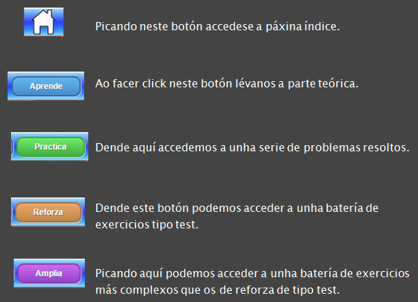 O usuario atopará no sitio web, áreas ben definidas: o menú principal da esquerda, os botóns da parte superior, os botóns inferiores e a área de contidos na parte central. O presente manual guiarannos no manexo das distintas áreas e as súas funcións, permitindo o dominio de toda as súas características. |