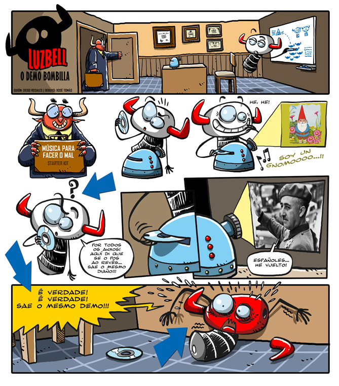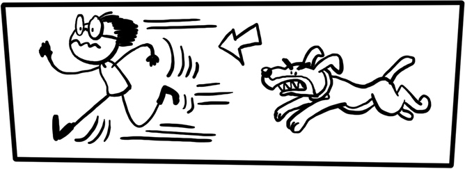 EJEMPLO 2: Observa de nuevo las flechas azules: el signo de interrogación para expresar duda, sorpresa o desconcierto; el cambio de color del bocadillo para mostrar, en este caso, un gran susto; el personaje, finalmente, transformado por ese susto: el color rojo de su rostro, las líneas cinéticas de temblor, y las gotas de sudor chorreando de su cara. |