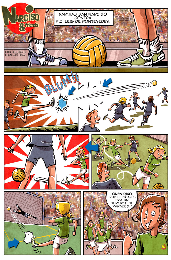 EJEMPLO 1: Observa las flechas azules. Van dirigidas a diferentes estereotipos visuales: el impacto del balonazo, las líneas cinéticas, la forma estrellada para el"caño" en el fútbol, y de nuevo el chut y las líneas cinéticas del balón que entra en la portería. |
