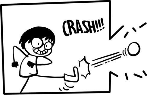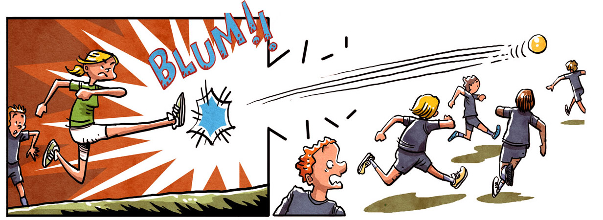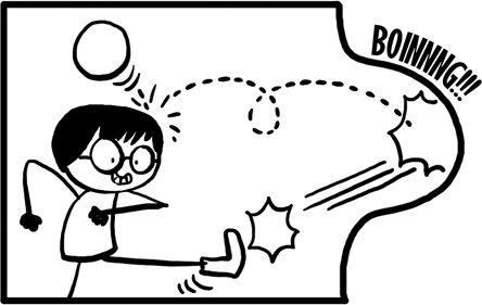 EXEMPLO 4: A viñeta rompe co balonazo da rapaza. Grazas a este efecto, a escena ten moita máis forza expresiva. E, para contrastala, a seguinte viñeta non ten marco. É un exemplo claro de viñeta que se adapta á historia, para darlle máis sentido. |