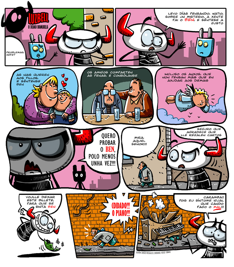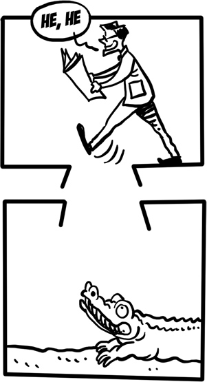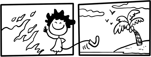 EXEMPLO 1: Observa esta páxina, e os tipos de viñeta que hai nela: temos as clásicas, rectangulares; tamén as hai redondeadas, elásticas; hai unha viñeta sen marco (alguén podería dicir que iso non é unha viñeta); outra é trapezoidal; e a última está pechada por un lado e aberta por outro. Ás veces o bocadillo "rompe" os bordes da viñeta. Conclusión: podemos facelo todo coas viñetas, sempre que teñan un sentido na historia, e compositivamente garden un equilibrio. |