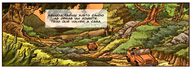 EXEMPLO 2: Nesta viñeta apaisada temos un recurso chamado "dinamismo dentro da viñeta". Consiste nun efecto polo que un elemento (neste caso, o coche), aparece varias veces na mesma viñeta, como se fosen diferentes momentos, pero no mesmo escenario. Que conseguimos así? Aforramos facer tres viñetas nos tres puntos diferentes do camiño, dámoslle á historia frescura e rapidez, e obtemos un efecto estético especial, que capta a atención do lector inmediatamente. |