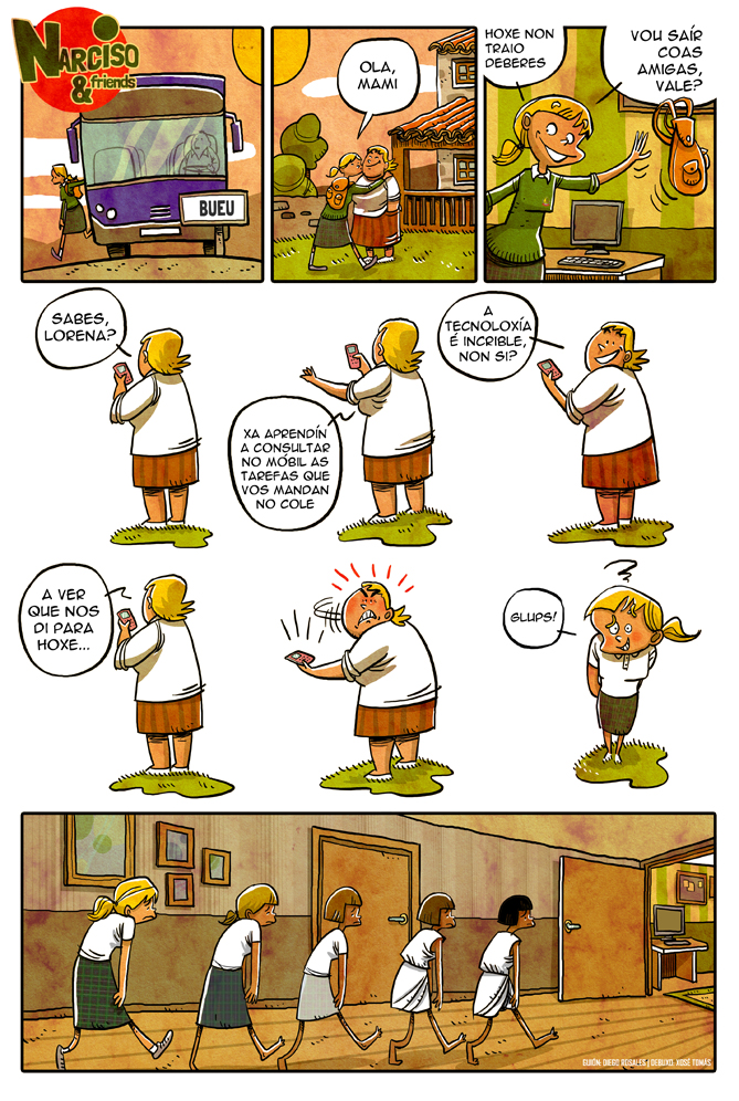 EXEMPLO 3: Dous recursos interesantes nesta páxina. Por unha banda, unha secuencia de viñetas sen marco. Quizais poderiamos pensar que non son viñetas, pero é máis correcto pensar que si as hai, pero sen marco. A fin de contas, son doses, fragmentos narrativos, que poden ou non ter unha liña exterior (circular, poligonal, irregular, ...). Na última viñeta volvemos ter o "dinamismo dentro da viñeta". Unha nena vai evolucionando ao longo do corredor, do mesmo corredor. Transmite a idea de que a evolución é constante no tempo, a medida que camiña cara a súa habitación, e pouco a pouco se vai convertendo nunha escrava (é castigada pola súa nai a facer uns deberes que non fixo). |