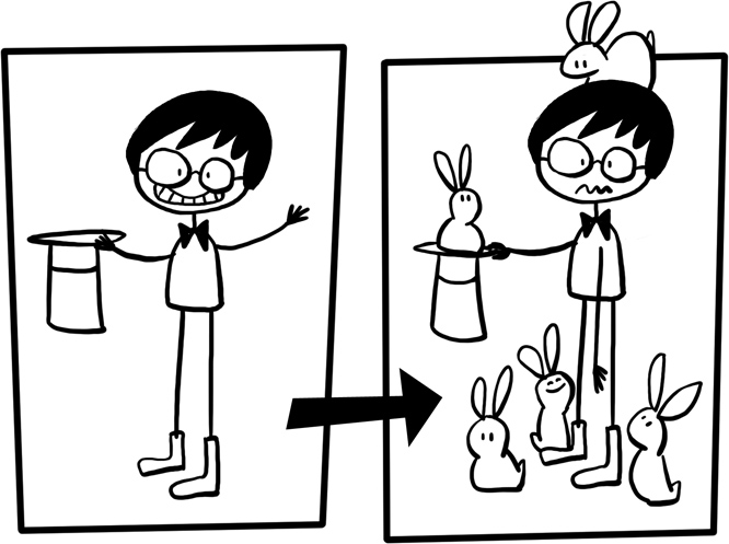 EJEMPLO 1: Observa cómo en la primera viñeta la mujer está despidiendo al taxista. En la segunda el taxi ya no está. Los pájaros sobrevuelan otra zona, y la nube desapareció. Pasó el tiempo entre una viñeta y la otra. Esto es una elipsis. La intención en este caso es "detener el tiempo", causar sensación de silencio antes de un reencuentro familiar importante. |