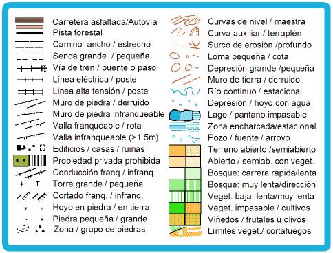 Tódolos mapas de orientación usan o mesmo código de símbolos e cores, unha simboloxía internacional, aprobada pola Federación Internacional de Orientación, de tal forma que aínda que cambiemos de país, entenderemos perfectamente o mapa.