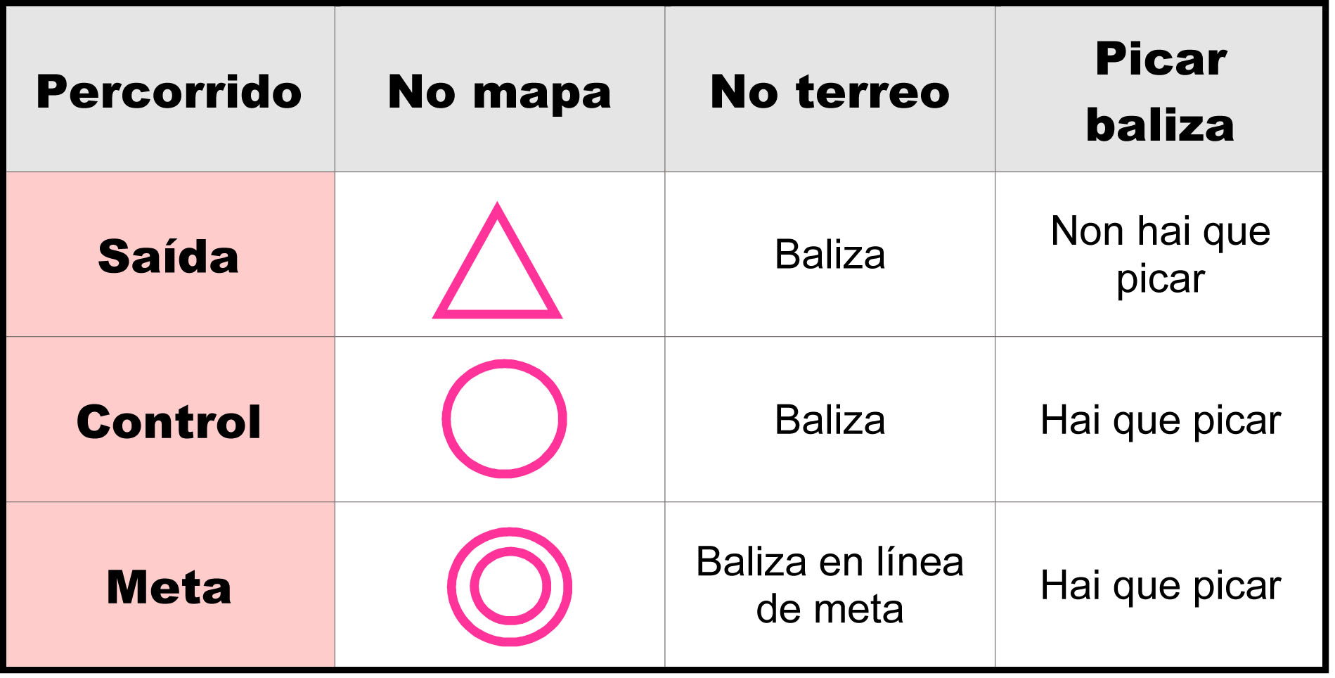 En orientación, o percorrido represéntase en cor rosa, de igual forma que a saída, controis e meta. Estes elementos veñen debuxados no mapa da seguinte forma: