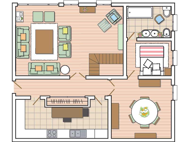 2- Il y a une cuisine, un salon, une salle de bain, une salle à manger et une chambre.