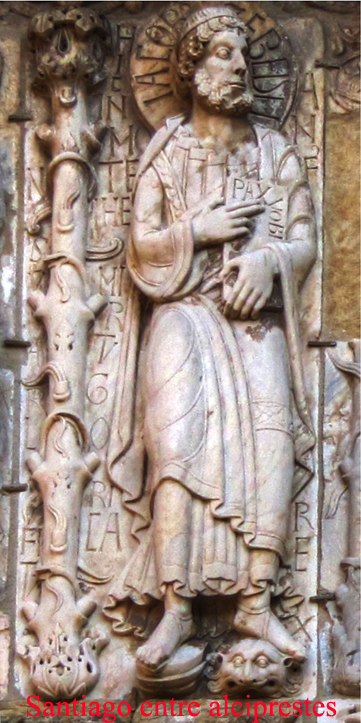 A acumulación de temas tan diversos no friso parece producir unha certa sensación de desorde como consecuencia das sucesivas reformas, pero conserva algunhas obras excepcionais coma a de Abraham xurdindo do sepulcro, en mármore, procedente do proxecto do pórtico occidental, situado debaixo dunha imaxe do Salvador (de época gótica). Debaixo de Abraham, tamén en mármore, aparece unha pequena figura representando a Moisés e máis abaixo, un crismón e dous leóns de pedra, símbolos de Cristo, defensores do templo, que tamén aparecen nun lateral. Á esquerda do eixe central, unha obra mestra, Santiago entre alciprestes. Na Transfiguración, Cristo revélase como Deus a Pedro, Santiago e Xoán no monte Tabor. Á dereita do eixe central, no alto, colocáronse no século XIX seis figuras procedentes do coro de Mateo. Un apostolado que debía estar no friso orixinario aparece na esquina dereita. Os apóstolos formaron parte fundamental da vida de Xesús, que é o tema da portada, e difundiron a súa mensaxe. Outros motivos recoñecibles de diferentes tamaños disponse na parte esquerda do friso: unha Expulsión do Paraíso, un centauro, outros apóstolos... Anxos trompeteiros aparecen xusto por enriba das arquivoltas.