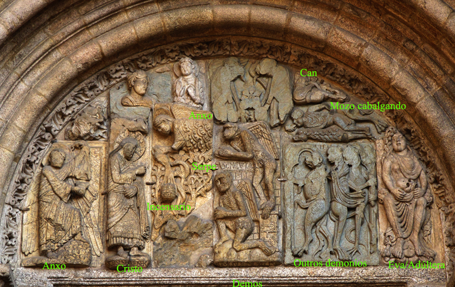 No tímpano esquerdo aparecen as tentacións de Xesús no deserto. Os dous anxos que rodean a Cristo (a segunda figura empezando pola esquerda) levan incensarios nas mans, aínda que un xa non se aprecie. O incensario do anxo da dereita, o que sae de entre as nubes, leva gravado un green man, un home verde, ao que lle saen follas e ramaxes da boca. Simboliza a forza e a maxia da terra e da natureza. Dous demos, un deles con cara de mono, tentan ao Señor, ofrecéndolle pedras para que as converta en pan. Por entre as follas dunha figueira repta unha serpe, símbolos do pecado orixinal e do mal. Na lastra da dereita outros demos con caras simiesca e de cans interpretan unha especie de danza macabra. Enriba deles un mozo monta un león, facendo soar un corno de caza e un can retórcese case irrecoñecible. Para algúns autores, a muller da esquerda é Eva, símbolo do pecado e da morte. O Calixtino descríbea como a Adúltera, condenada a soster a caveira do amante por toda a eternidade, alegoría da luxuria. Un motivo para a reflexión sobre a condición da muller no medievo. Sen dúbida unha das obras mestras da escultura románica, moi probablemente do mesmo autor que a figura do rei David que imos comentar agora.