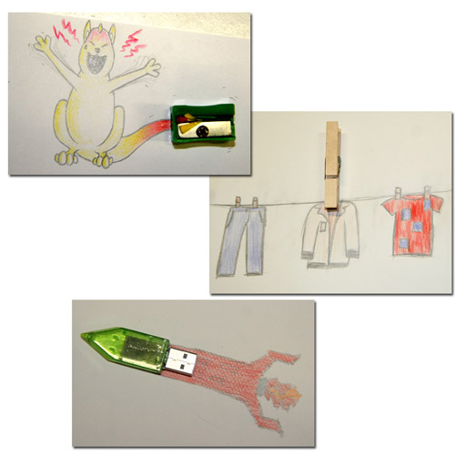 Se decide hacer obras híbridas, que integran objetos cotidianos en ilustraciones bidimiensionales.