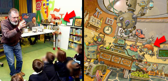En este caso el libro, como ya se ha visto en la sección relacionada con las PARTES del álbum ilustrado, la temática son los robots, todo tipo de robots. Los personajes, en teoría los enemigos de los niños, están hechos a base de materiales de deshecho, de restos mecánicos que los humanos rechazan, de tornillos, de lavadoras viejas, de partes de ventiladores o cafeteras, ...El reciclaje es, pues, un tema de fondo.