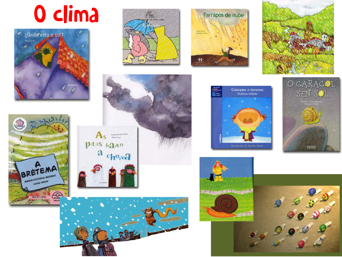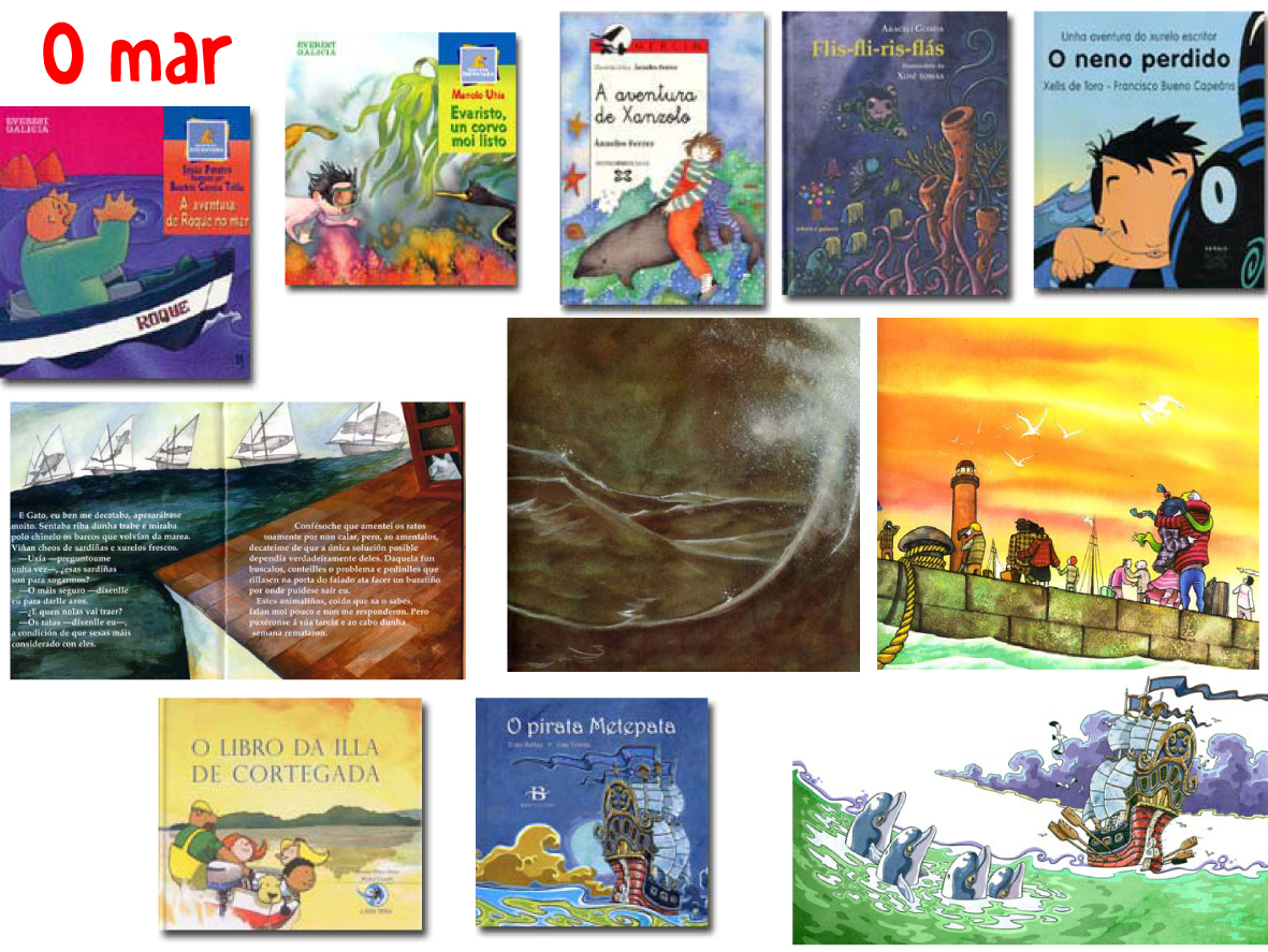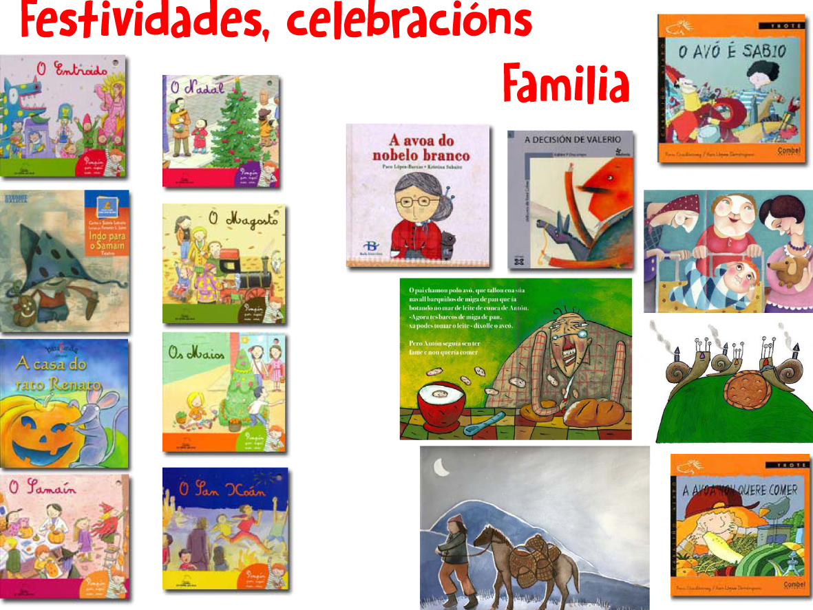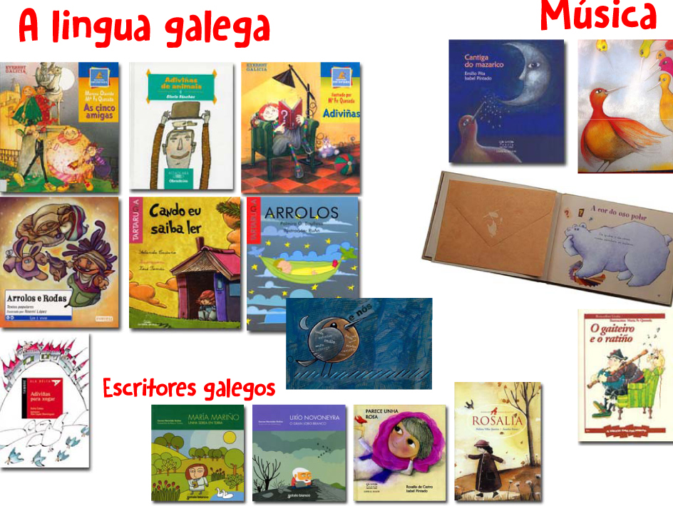 The special communicative codes shared by the members of a culture represent one of the most relevant aspects to define it: the language. The Galician language has been the topic, itselt, for many books for pre-readers: albums about riddles, sound poems, and the self analysis of the code have jumped to illustrations, as the final means to explain them. The five vowels, drawn as five women in Maife Quessada's illustrations, bring the five sounds to children in an inductive way. In another book, "O peizoque Roque", a little bird grows thanks to eating the words he learns. Even music