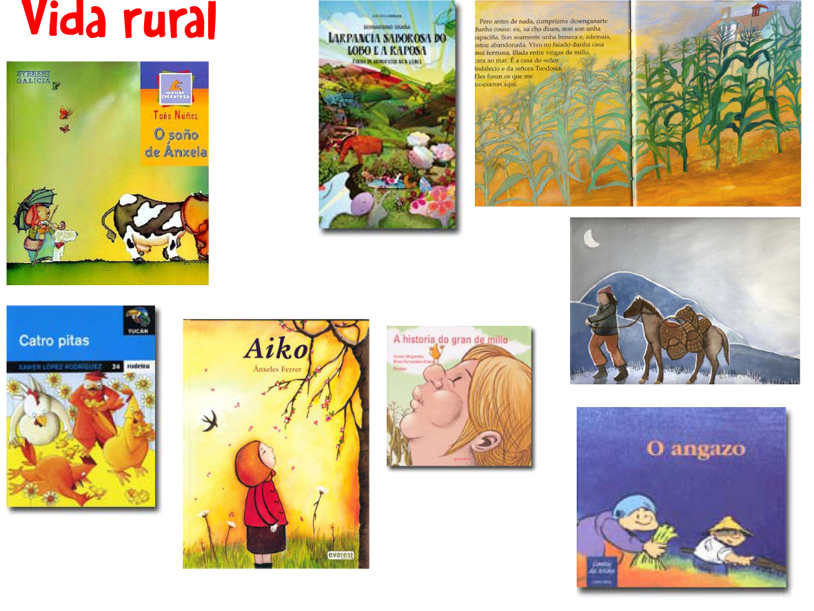 Readers can see rural life as a confluence of different various elements: traditional houses, farm animals, landscape, and, what may be more interesting, traditions and ways of life. A good example of this is "O soño de Ánxela " (Ánxela's dream), in which the visual story takes us back to old ways of living in the ancient mountains of Os Ancares. Related to this, in books like "Aiko" a sociological phenomenon which was inevitably associated to villages, emigration, appears beautifully depicted by the melancholy scenes of a father leaving the home land. Traditions and popular costumes are kept in illustrations, this way being preserved visually in a changing world, when the countryside is suffering strong transformations. |