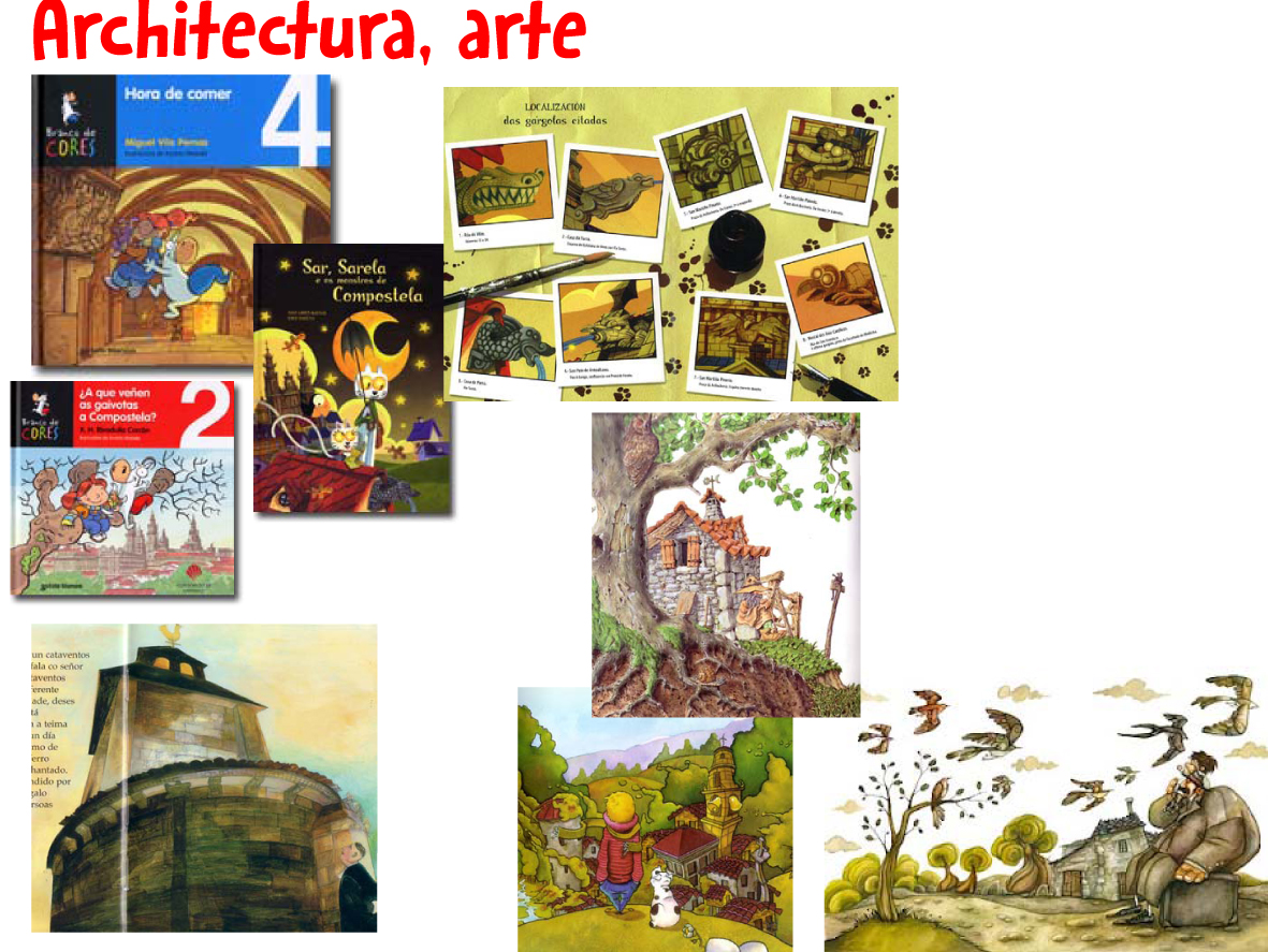 And at the end of the material heritage is art, architecture, and human creations which define the Galician style: in a considerable number of stories taking place in the countryside we can see traditional stone houses, as well as the surroundings of them (barns, the orchards, and similar elements). But going further, we can also know, thanks to illustrators like Kiko da Silva or Meixide, specific details of the Romanesque and Gothic art in Santiago de Compostela.