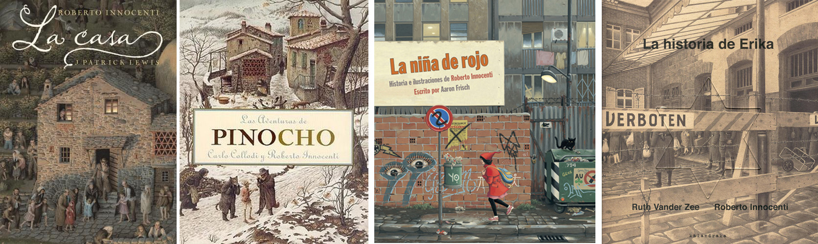 One of the interesting aspects of this work lies in observing the way he regulates the information between the narrative voice, the information conveyed by images, and the reader's historical knowledge: the boy does not understand the meaning of the flags haging everywhere. However, the reader does know this. There is a very interesting ambiguity between what the protagonist kid perceives, and the historical knowledge the reader has, because he really knows what is happening. This provokes a special subtile dramatism. Besides, the hard work carried out by Innocenty in documentation takes us to a special approach to the historical facts, for the quality of the recreation of buildings, uniforms, clothing in general, atmospheres, etc. WHITE ROSE is not a "protective" book. And it had to be Delessert, with his open view, free of prejudices, who dared to publish it. OTHER REMARKABLE WORKS: |