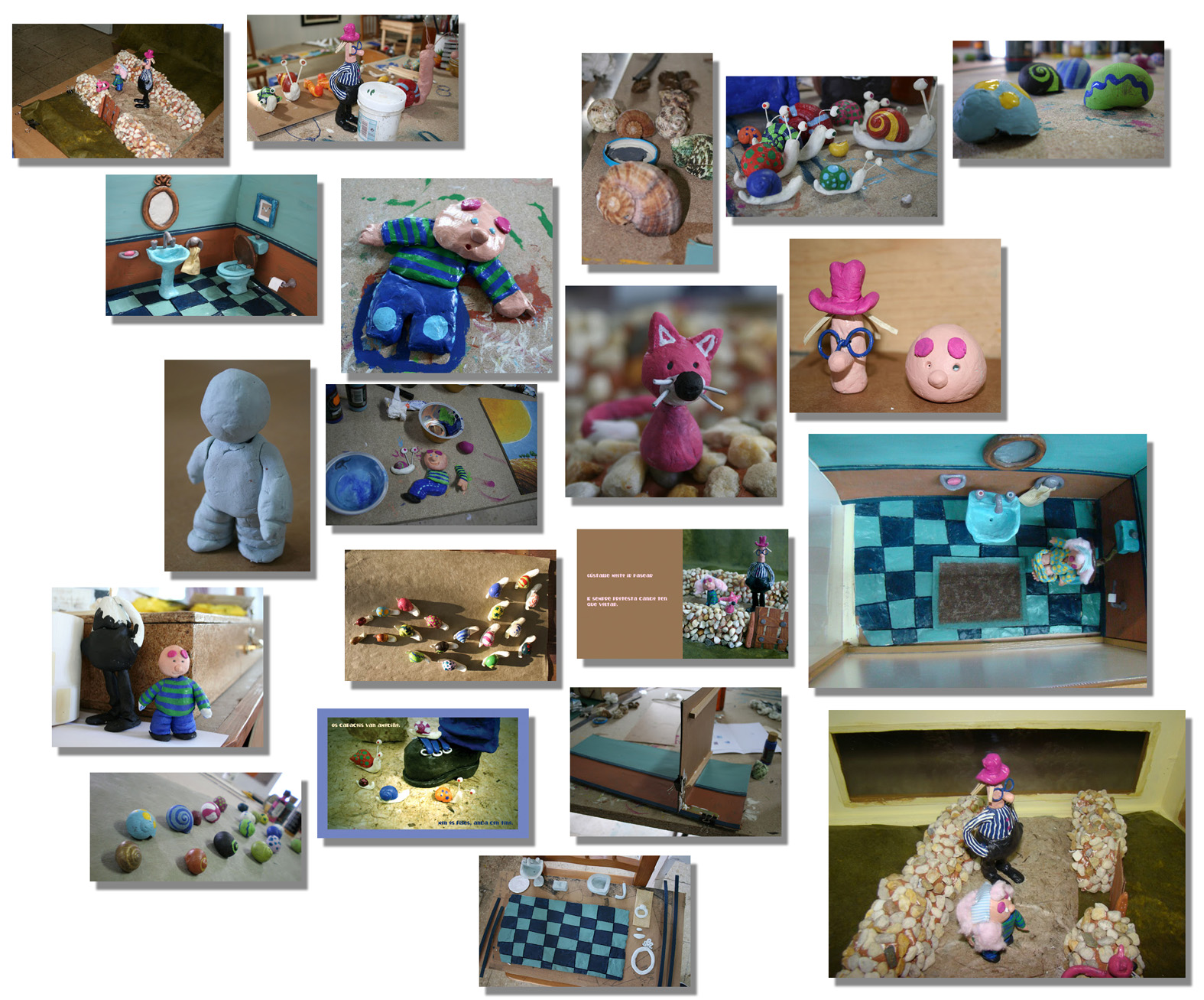 Los pequeños observan las maquetas, los diseños previos, y aprenden que para modelar figuras y escenarios es preciso primero planificar, diebujar, pensar los espacios, inventarles unas personalidades a los protagonistas. Demuestran especial interés en las conchas de los caracoles: recogerlas del suelo, algunas en la playa (los hay marinos), secarlas, y después pintarlas con pinturas acrílicas. Recoger piedras pequeñas, de tamaños similares, para hacer muros. Modelar barro y crear un suelo para el cuarto de baño. Incrustar alambres finos para crear las antenas de los caracoles, ... En esta fase tocaba estimular su curiosidad con algo esensial: el ejemplo. Se enfrentaron a la cosa misma, a los materiales, a las materias, las tocaron, las olieron ,... y ya estaban preparados (y estimulados) para realizar sus propias creaciones, que vinieron después. |