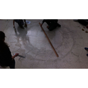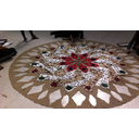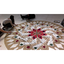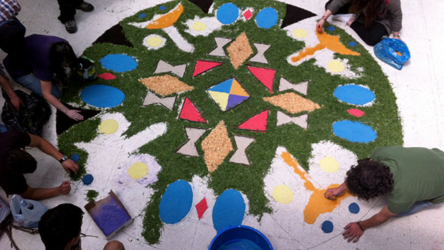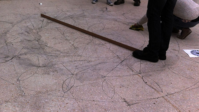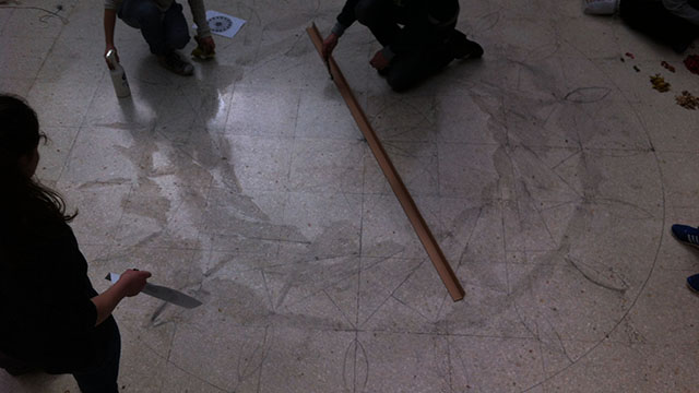 - Debuxamos a escala o deseño escollido sobre o chan, coa axuda de corda para os arcos e dunha vara longa para as liñas rectas.