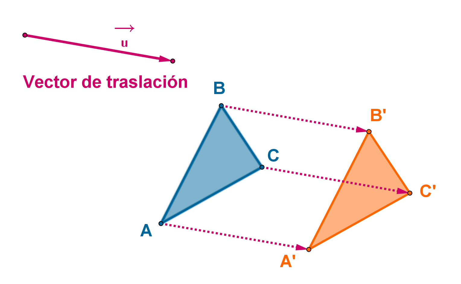 Hacer una traslación no es más que mover un objeto geométrico en línea recta una cierta distancia. Entonces, para poder definir una traslación lo único que necesitamos conocer es la dirección y el sentido del movimiento y la distancia a la que se dejará el objeto trasladado. Esta información puede resumirse mediante un vector. A este vector se le llama vector de traslación.