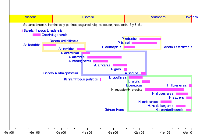 El término humano, en el contexto de su evolución, se refiere a los individuos del género Homo. Sin embargo, los estudios de la evolución humana incluyen otros homininos, como Ardipithecus, Australopithecus, etc. Los científicos han estimado que las líneas evolutivas de los seres humanos y de los chimpancés se separaron hace 5 a 7 millones de años. A partir de esta separación, la estirpe humana continuó ramificándose, originando nuevas especies, todas extintas actualmente a excepción del Homo sapiens.
