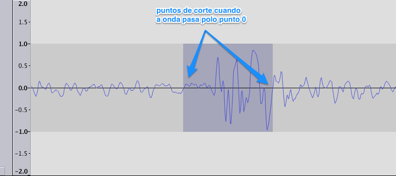 Dependendo de como fagamos os cortes pode acontecer que escoitemos pequenos "clics" no audio. Isto é debido a que hai un salto no momento do corte. O ideal é ver facer cortes limpos do audio para que haxa unha continuidade. Así o ideal é facer os cortes entre puntos que pasan polo marcador cero como podes ver na seguinte imaxe.
