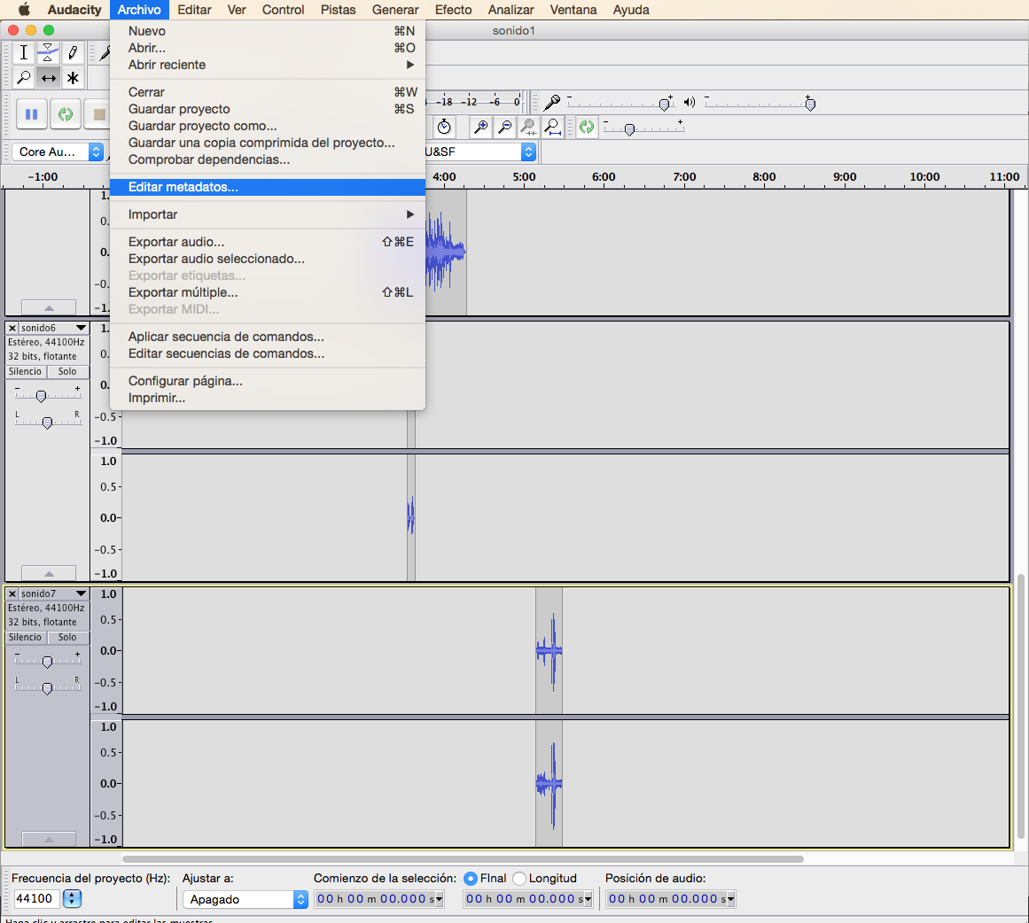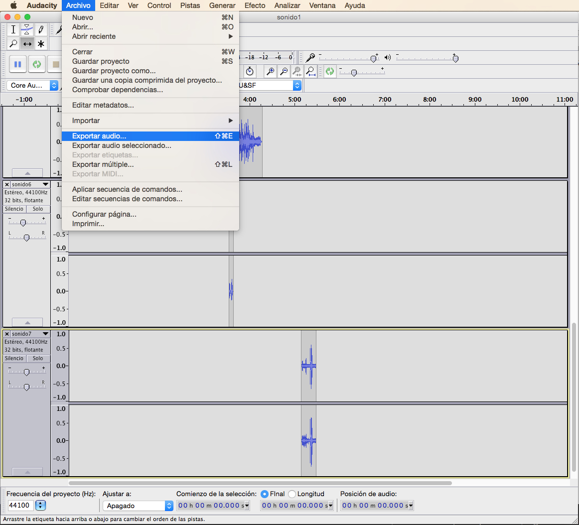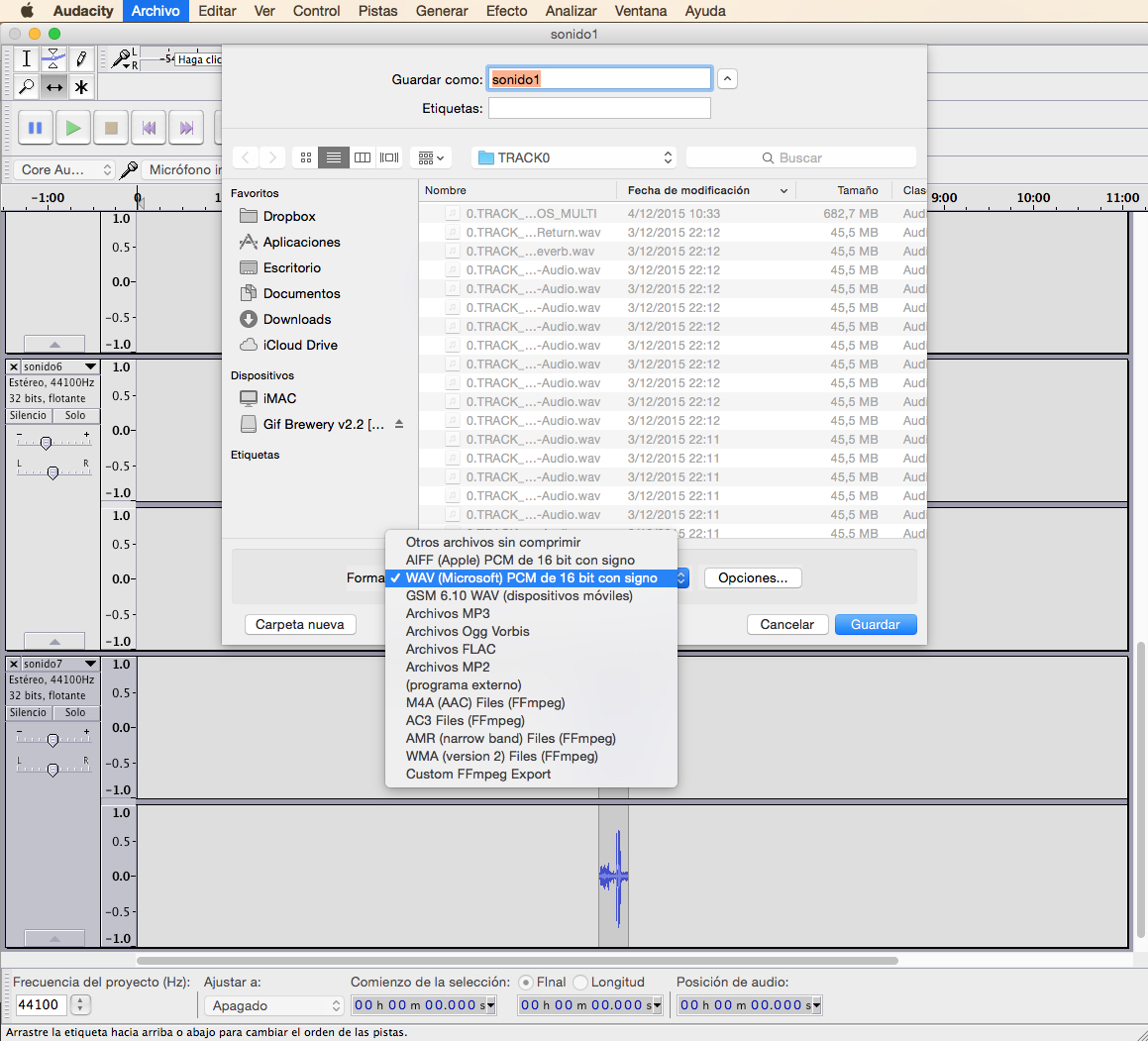 8. Exporta o traballo realizado en formato .wav a unha calidade de 44.100Kbps e 16 bits.