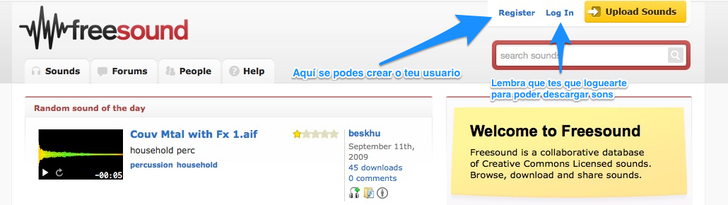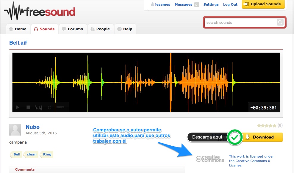 [Nota: Para poder descargar os sons de Fresound.org debes estar logeado, podes crear a túa conta ou pedirlle ao profesor que cree unha para toda a clase (a modo de exemplo para este exemplo desenvolvido pódese entrar utilizando a seguinte conta Username: iesames / Password: Bertamirans)]
