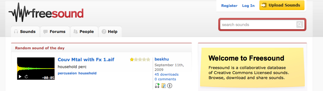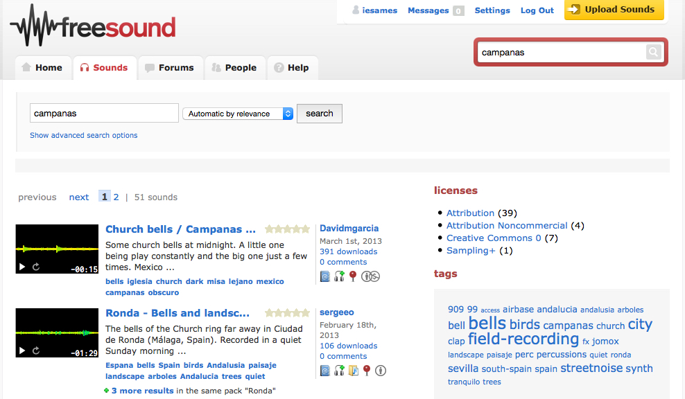 En Freesound podes facer búsquedas dos sons que precises e que foron engadidos por outros usuarios. Para ampliar os resultados procura buscar en varios idiomas (ex: castelán e inglés).