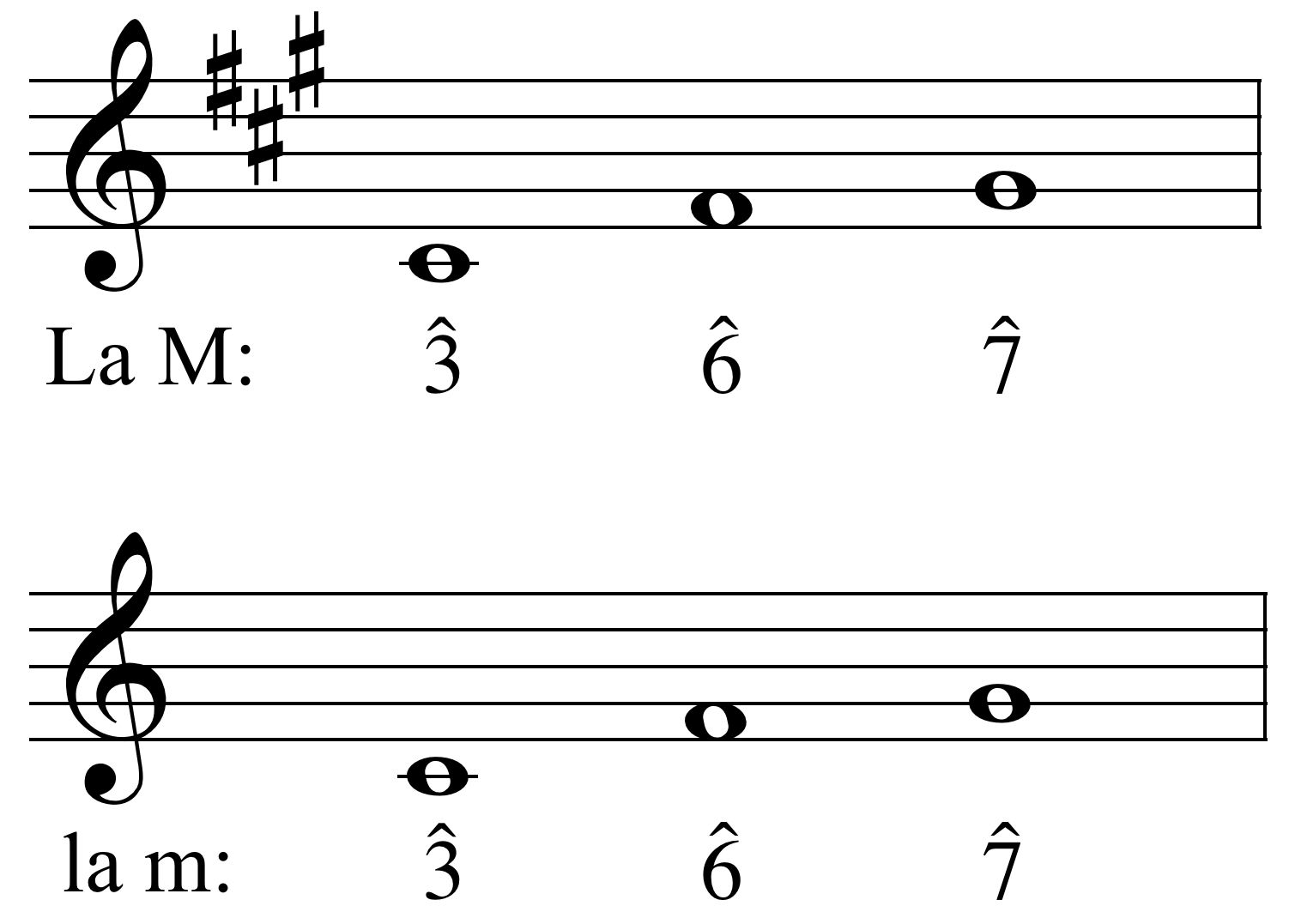 Se comparamos as dúas armaduras dos modos dunha tonalidade calquera, por exemplo as de La maior e La menor, decatarémonos de que os sons diferenciais entre ambas son o 3, o 6 e o 7. O mesmo sucede co resto das tonalidades.
