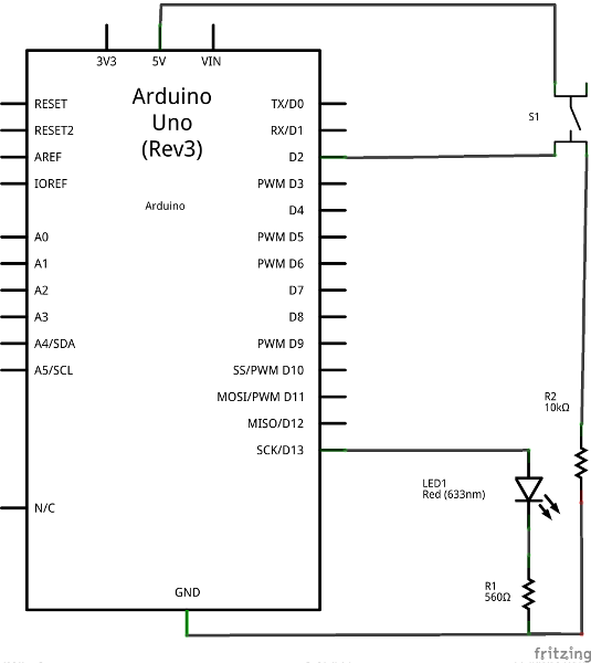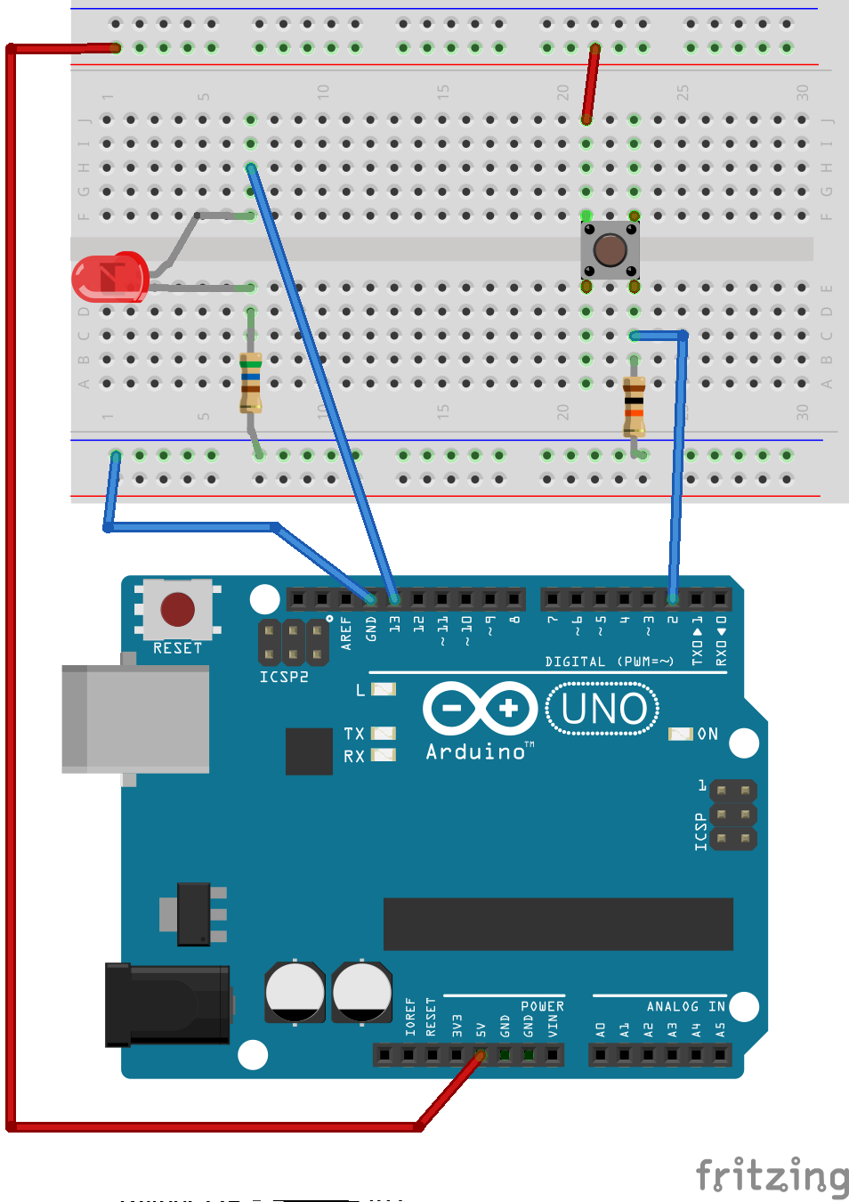 Conectaremos un pulsador no pin dixital 2, e un LED no pin 13, coas súas resistencias correspondentes, do mesmo xeito que fixemos na práctica de “Pulsadores controlando LEDs”. Para resolver os problemas das propostas necesitarás conectar un segundo LED e un segundo pulsador coas súas resistencias.