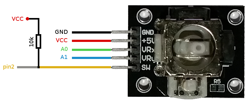- SW ou KEY: É o pulsador. Conectarémolo a unha entrada dixital, no noso caso ao pin2. Debes engadir unha resistencia de 10 kΩ para conectalo como vimos nas prácticas de pulsadores. Dependendo do modelo de joystick, podemos atopar que o pulsador conecta entre VCC e o pin SW, ou entre GND e o pin SW (Podes comprobalo cun polímetro). No primeiro caso a conexión sería Pull-Down (Temos un 0 por defecto e un 1 ao premer) e no segundo caso sería Pull-Up (temos un 1 por defecto e un 0 cando prememos)