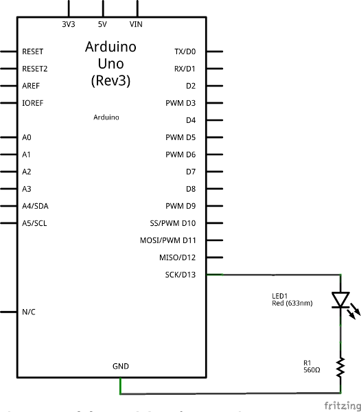 Debemos conectar entre o pin 13 e a masa (GND) un LED e unha resistencia. Podes utilizar calquera das indicadas, obtendo diferentes valores de luminosidade. Nos vindeiros programas utilizarei por defecto resistencias de 220Ω para protexer os LEDs.